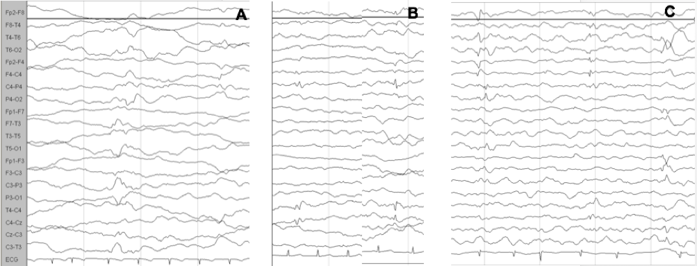 Figure 1: Evolution of the EEG pattern at 3, 4 and 5 months of age (a, b, c), which shows the tendency of epileptiform abnormalities to become multifocal.