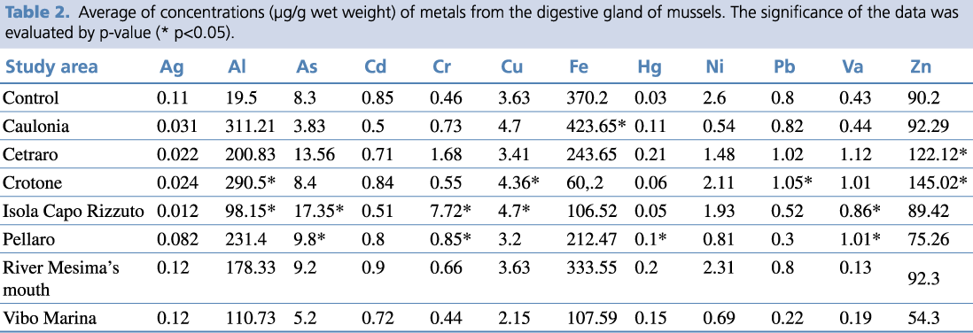 (13.56 and 17.35 μg/g w.w respectively); Cd concentration was found to be slightly higher than control (0.85 μg/g w.w) only in river Mesima’s mouth station (0.9 μg/g w.w); Cr concentrations were found to be slightly higher than control (0.46 μg/g w.w) in Crotone, river Mesima’s mouth, Caulonia, and Pellaro stations (0.55, 0.66, 0.73, and 0.85 μg/g w.w respectively), notably higher than control in Cetraro station (1.68 μg/g w.w), and considerably higher than control in Isola Capo Rizzuto station (7.72 μg/g w.w); Cu concentrations were found to be slightly higher than control (3.63 μg/g w.w) in Crotone (4.36 μg/g w.w), Caulonia, and Isola Capo Rizzuto stations (being 4.7 μg/g w.w in both stations); Fe concentration was found to be higher than control (370.2 μg/g w.w) only in Caulonia station (423.65 μg/g w.w); Hg concentrations were found higher than control (0.03 μg/g w.w) in all the station examined, precisely: slightly higher in Isola Capo Rizzuto and Crotone stations (0.05 and 0.06 μg/g w.w respectively), notably higher in Pellaro, Caulonia, and Vibo Marina stations (0.1, 0.11, and 0.15 μg/g w.w respectively), considerably higher in river Mesima’s mouth and Cetraro stations (0.2 and 0.21 μg/g w.w respectively); none of the stations tested were found to have Ni concentrations higher than control; Pb concentrations were found to be slightly higher than control (0.8 μg/g w.w) in Caulonia station (0.82 μg/g w.w), and notably higher than control in Cetraro and Crotone (1.02 and 1.05 μg/g w.w respectively); Va concentrations were found to be slightly higher than control (0.43 μg/g w.w) in Caulonia station (0.44 μg/g w.w), notably higher than control in Isola Capo Rizzuto station (0.86 μg/g w.w), and considerably higher than control in Pellaro, Crotone (1.01 μg/g w.w in both stations), and Cetraro (1.12 μg/g w.w); finally, Zn concentrations were found to be slightly higher than control (90.2 μg/g w.w) in Caulonia and river Mesima’s mouth stations (92.29 and 92.3 μg/g w.w respectively), and notably higher than control in Cetraro and Crotone stations (122.12 and 145.02 μg/g w.w respectively).