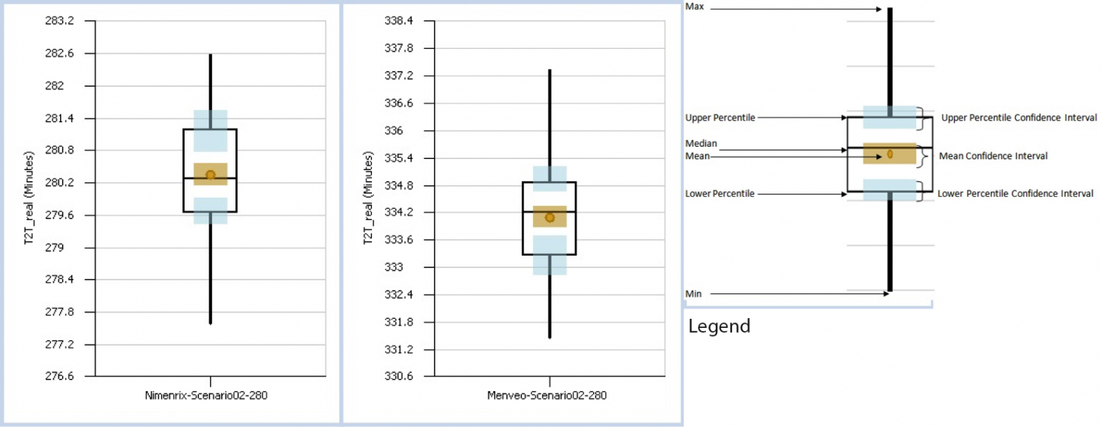 The first two scenarios show that with a clinical area capacity of two units, a target population per session of 300 people, as stated by WHO, cannot be served by using the Menveo® vaccine in real world vaccination POD. Thus, the comparison of two vaccines can only be performed by decreasing the target to 280 people. Having established this target, for the real world vaccination POD the average free time percentage (FT_real) is about 17.54% and 1.73% for Nimenrix® and Menveo® respectively (see Figure 9 at column FT_real, scenarios Nimenrix-Scenario02-280 vs Menveo-Scenario02-280). More specifically, the next two figures (Figure 10 and Figure 11) show SMORE (Simio Measure of Risk & Error) plots including FT_real minimum, maximum, mean, median (with upper and lower percentile) and confidence intervals.