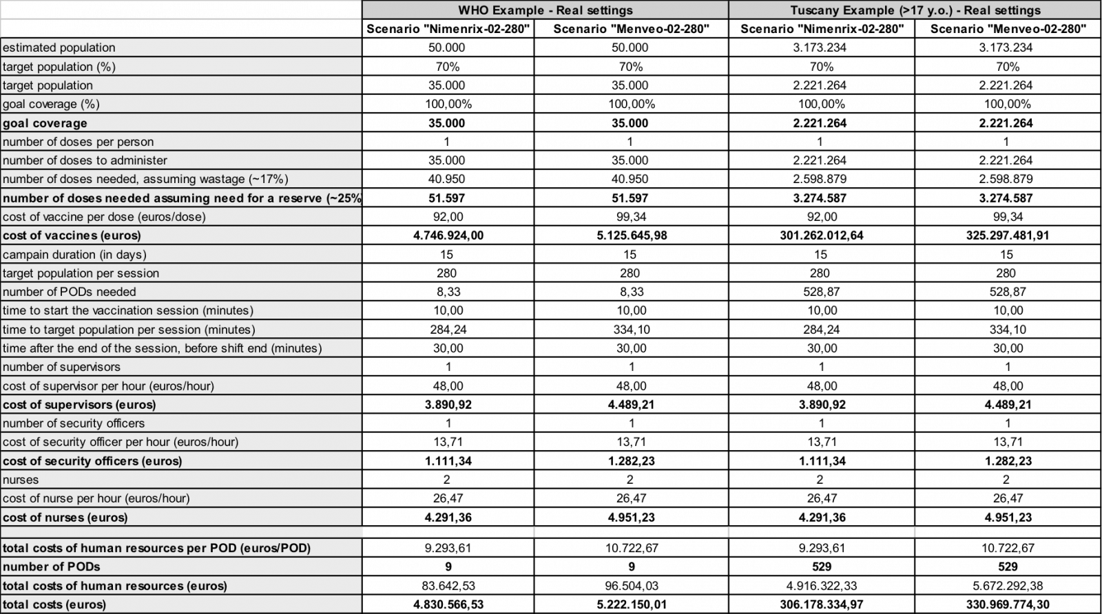 Figure 14. Examples of economic implications. In case of meningitis epidemic and according to recommendations by the WHO, operators of each involved vaccination POD can be temporary hired to cover the target population within 2 weeks from the start of the vaccination campaign. The free time (if any) could be use to close the POD itself in advance for having a cost saving (assuming operator unitary costs per hour).