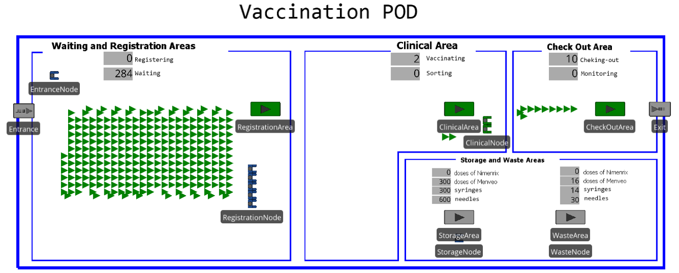 The discrete-event simulation (DES) of the vaccination POD, i.e., the simulator (see Figure 6), is implemented in Simio version 10 (build 168.16501), an integrated development environment for realising general-purpose simulations.18