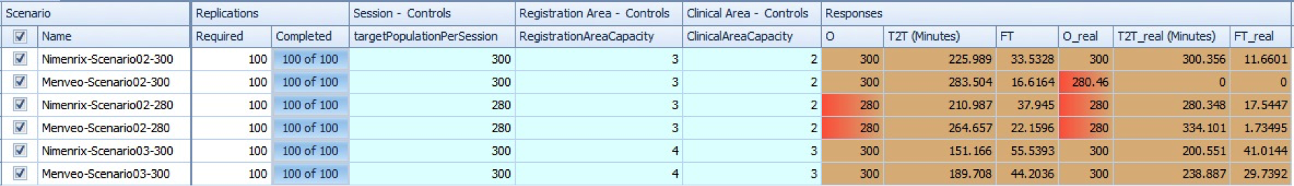 Having fixed exactly the same relevant parameters for both vaccination POD (as described in more in detail in the previous section, e.g., the shift duration to 380 minutes) and by varying the target population per session as control variables, the number of vaccinators (i.e. the clinical area capacity) and the presence or absence of supporting personnel (i.e. the registration capacity which characterises the ideal and real world setting, respectively), there are six analysed vaccination scenarios (Figure 9). Furthermore, due to the randomicity of the parameters vaccine reconstitution and administration length of times, 100 simulation replications per simulation scenario were executed.