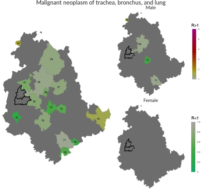 For the overwhelming majority of the diseases, there was no significant difference in excess or defect. Overall, these data suggest the absence of local factors impacting on the health status of residents.