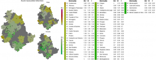 Figures 3-10 show the incidence data for all towns of the Umbria Region. Each figure includes 3 maps, one referring to the whole population (left side of the figure), and the other two to the male sex (right side, upper portion of the figure) and to the female sex (right side, lower portion of the figure).  The diagnoses showing a risk higher than 1 in comparison to Italy are highlighted in color scales ranging from brown to violet for diagnoses showing a risk >1, and from light green to deep green for diagnoses showing a risk <1. The color scales are represented in bars on the right side of each figure. In the maps, towns are identified by means of a unique number; this number, along with the name of the town, the risk carried by residents (M = males, F = females, M+F = whole population) and the color scale of the risk are reported at the bottom of the figure. The borders of the two towns of interest (Panigale and Piegaro) are highlighted in bold.