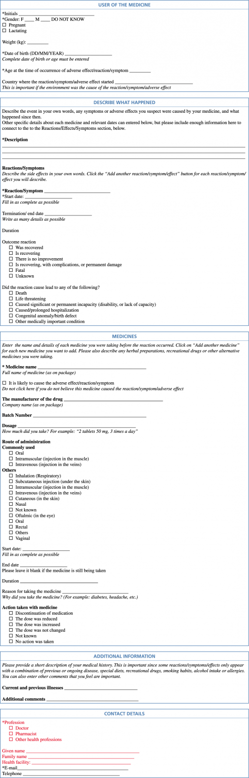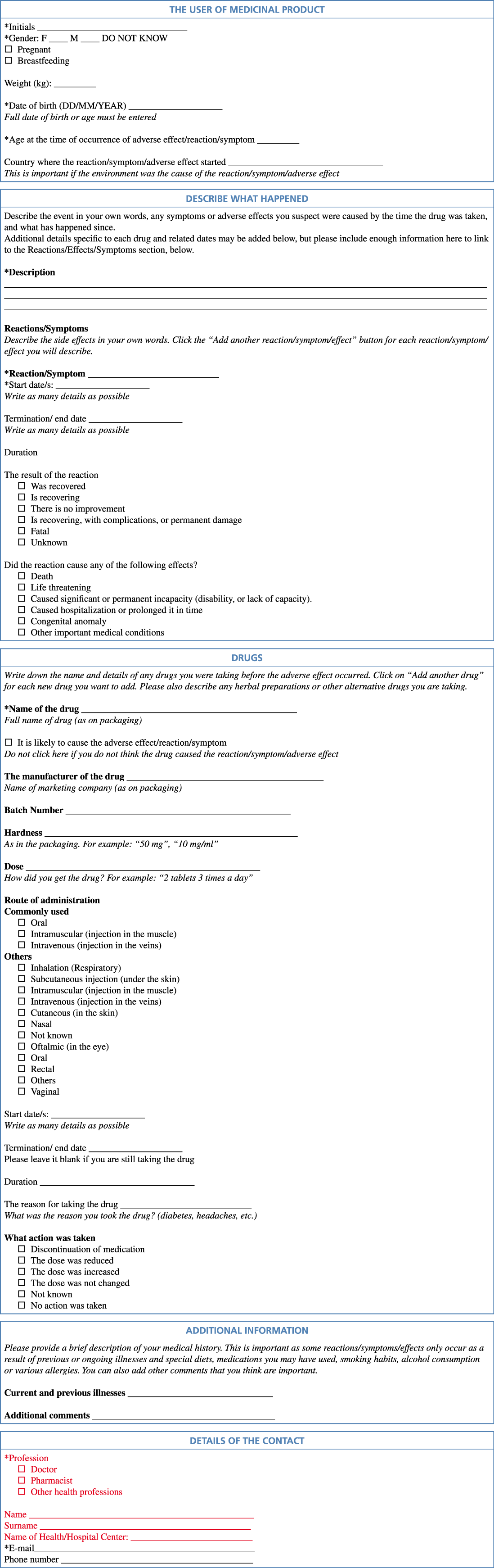 Figure 1. ADR reporting form for patients. (*) Obbligatory fields