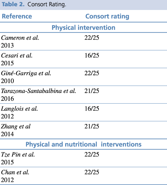 Physical and nutritional combined intervention, in Chan et al.,29 showed to have significant effects on increasing in 25 (OH) vitamin D levels at 12 months (p=0.006); Tarazona-Santabalbina25 evidenced a relevant improvement of another biochemical marker such as the plasma protein carbonyls levels at 24 weeks (p=0.05), performing only a physical program.