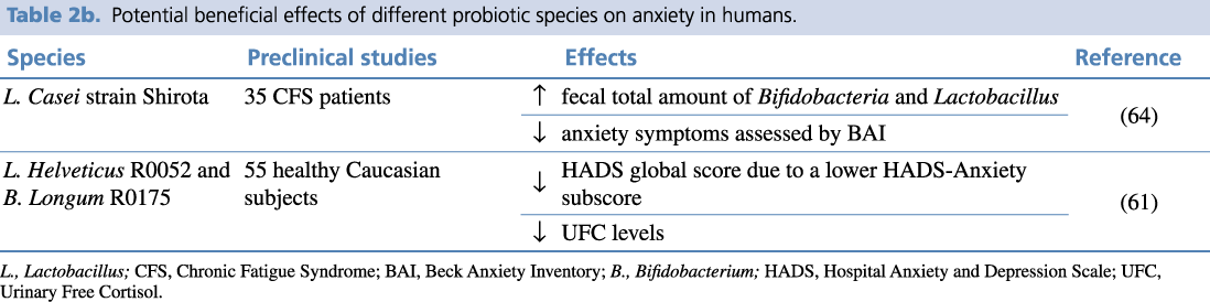 Table 2b. Potential beneficial effects of different probiotic species on anxiety in humans.