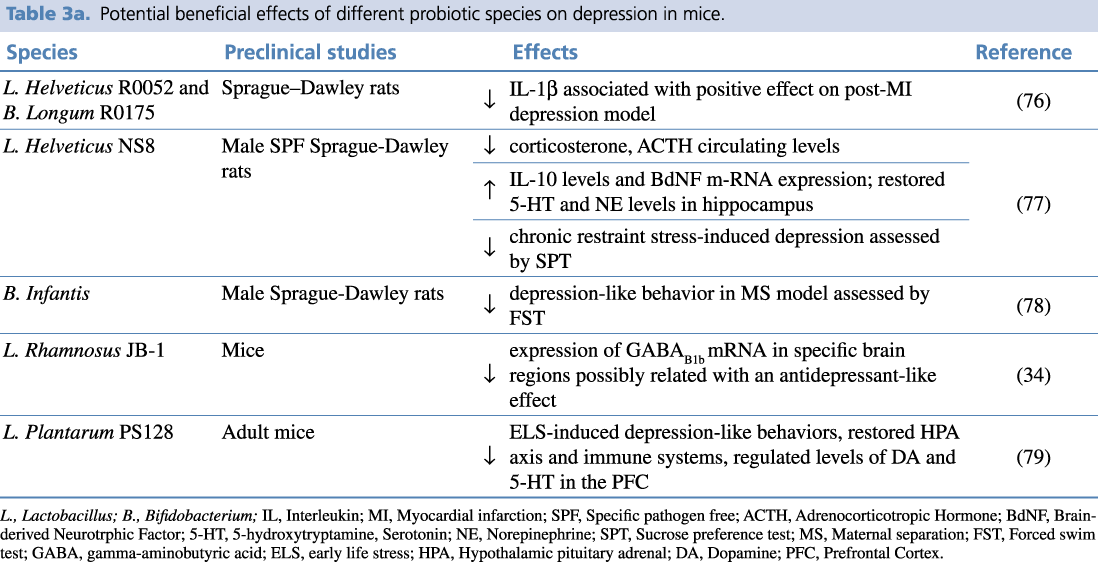 Table 3a. Potential beneficial effects of different probiotic species on depression in mice.