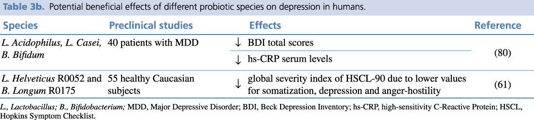 Table 3b. Potential beneficial effects of different probiotic species on depression in humans.