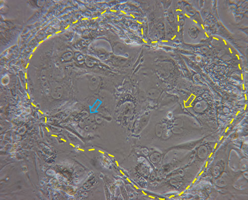 Figure 2. Dashed line highlights a colony of TSCs cultured for three days in basal medium (without heparin and FGF4) in which syncytialized structures are evident (yellow arrow) together with cluster of cells in the process of forming syncytia (blue arrow).