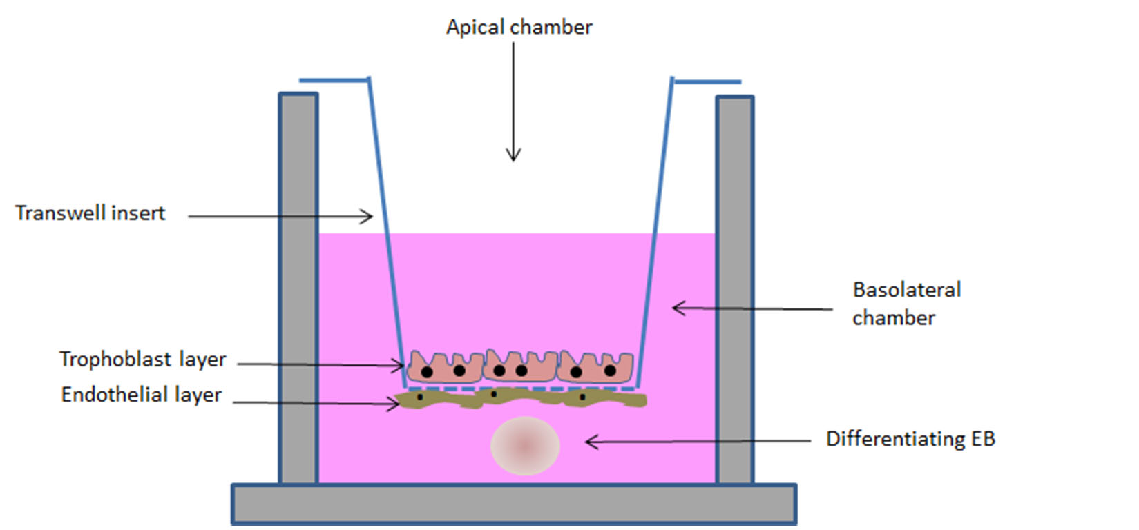 Figure 3. Schematic representation of the bEST in vitro model. A porous transwell culture insert, on which syncytiotrophoblast and endothelial cells (to simulate the placental barrier) are seeded, separates two compartments: an apical compartment, in which the tested compound is added, and a basolateral chamber, in which a differentiating embryoid body (EB, to resemble the embryo) is cultured.