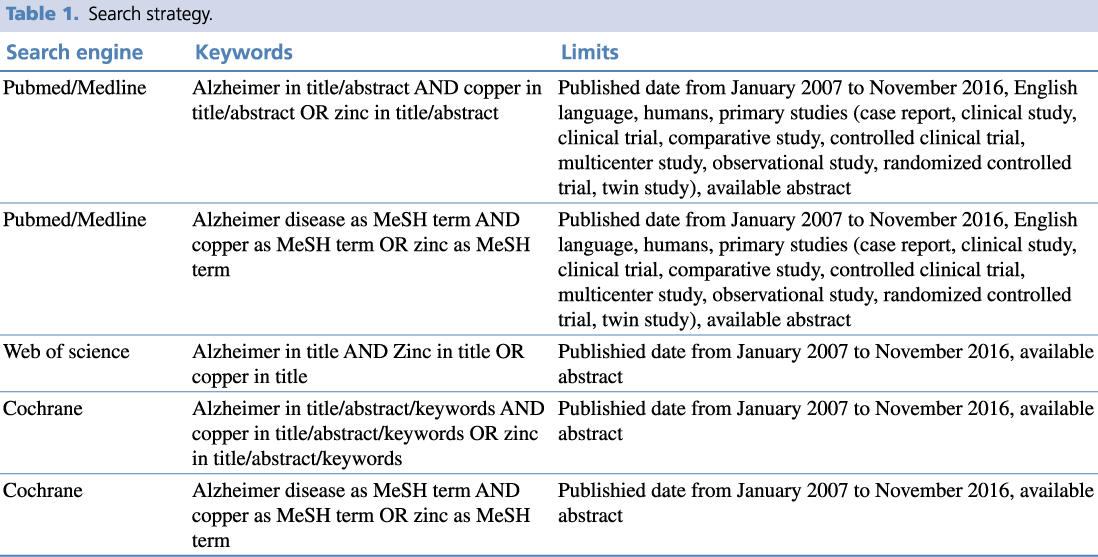 Only original studies measuring metal concentrations – except for Aluminium – in biological matrices (blood, urine, hair, nails, cerebrospinal fluid, brain tissue) in AD subjects were considered suitable for inclusion. Cases followed Alzheimer’s disease international diagnostic criteria: NINCDS—ADRDA, DSM-IV, or BRAAK criteria for post-mortem studies.