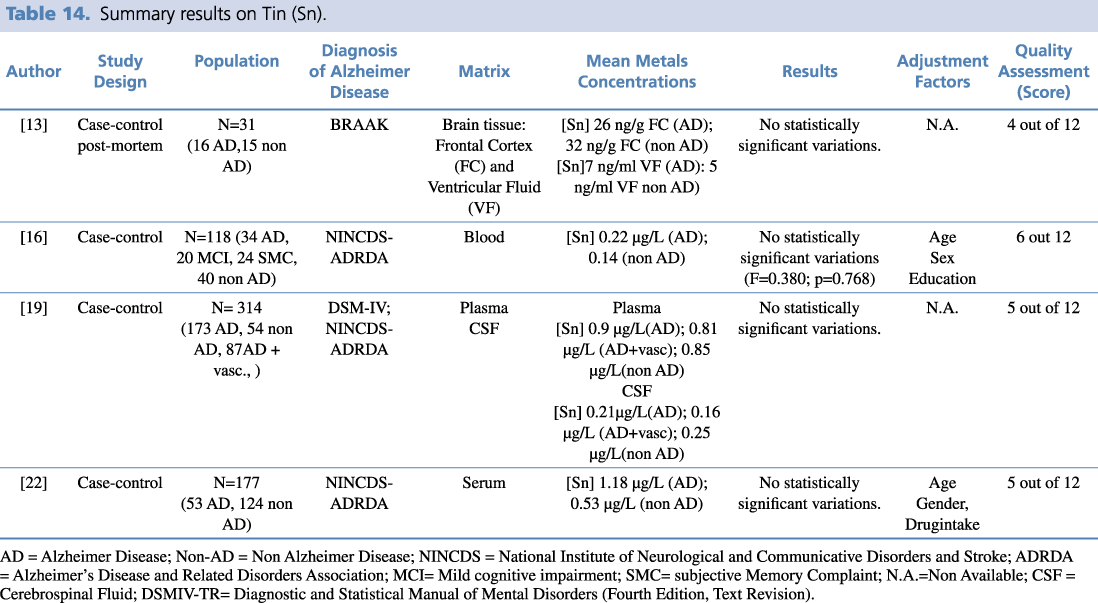 The most part of the 44 eligible studies investigating difference in metals concentration reported no univocal outcomes.57 Only some elements gave a clear tendency of results. Chrome, molybdenum, nickel and tin showed no real difference between AD and non-AD subjects, irrespectively to the biological matrix evaluated.