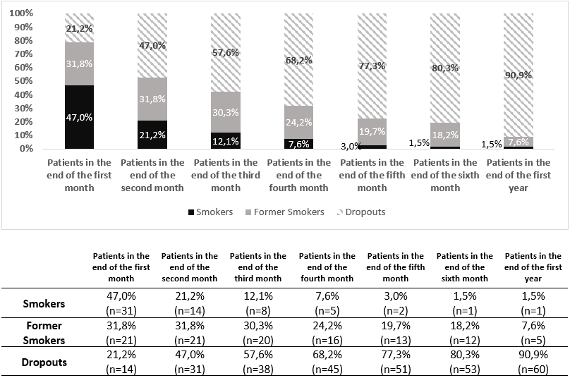 One year after the beginning of treatment, 90.9% (n=60) of the study population dropped the program. Among these subjects, reached by telephone recall, 28.3% (n=17) had ceased smoking.