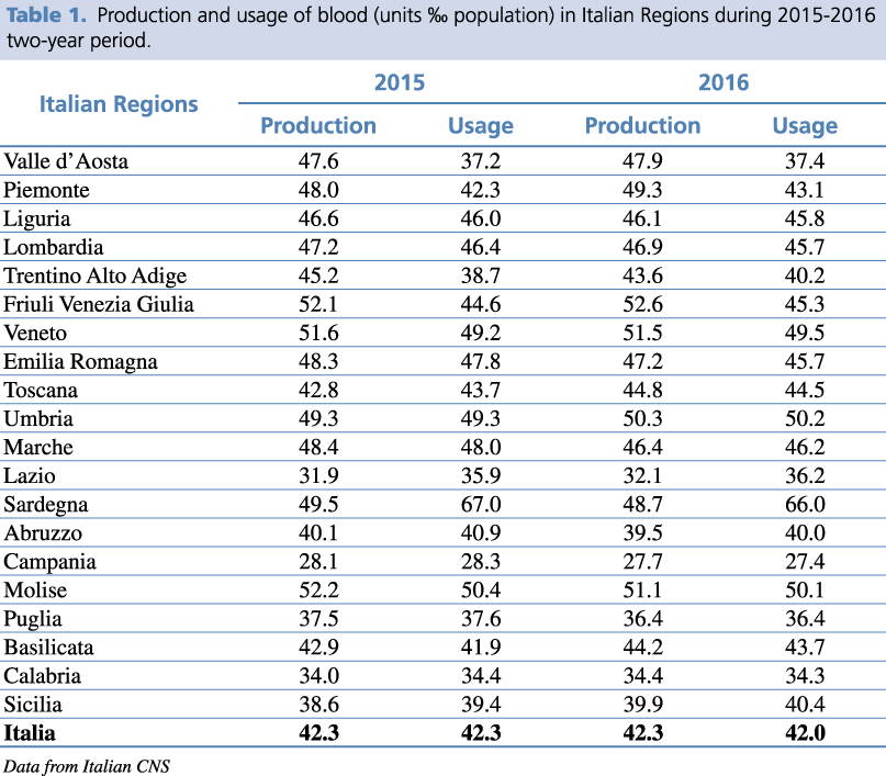 According to data provided by the National Institute of Health (Istituto Superiore di Sanità, ISS), Italy has been a self-sufficient country since 2010.12 Data from the National Blood Centre (NBC) highlight a peak of donations in Italy in 2012, with a production of 44.5 blood units per 1000 inhabitants. However, 2014 reported the lowest donation rate of about 42 blood units per 1000 inhabitants; the same rate reported for the following two years (2015 and 2016), as shown in Table 1.